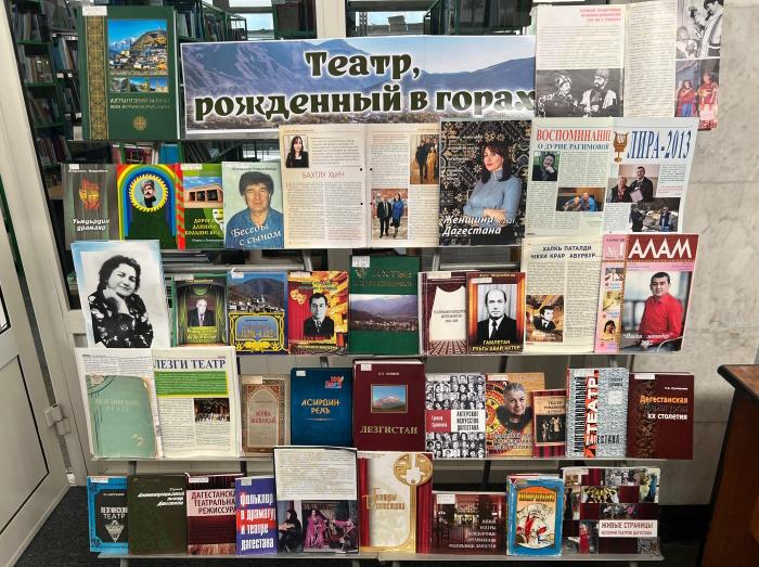 В сентябре этого года Государственный лезгинский музыкально-драматический театр им. Сулеймана Стальского отмечает свой 120-летие со дня основания. К этому юбилею в отделе краеведческой и национальной литературы Национальной библиотеки РД им. Р. Гамзатова открылась книжная выставка «Театр, рожденный в горах». На ней выставлены книги, журналы, газеты, в которых напечатаны материалы о лезгинском театре. Внимание пользователей привлекают книги театроведа Гулизар Султановой и поэта, литературоведа, театрального критика Азиза Мирзабекова. В их книгах представлены творческие биографии корифеев дагестанской театральной сцены и ведущих артистов, режиссерах и исследователях театра, а также напечатаны интересные статьи, посвященные драматургам, композиторам и художникам, сотрудничавшим с театром. А в разных изданиях режиссера, драматурга Э.С. Наврузбекова рассказываются о становлении и творческом развитии Лезгинского театра, а также через образ автор правдиво рассказывает о своей жизни, призывают людей искусства служить избранному пути честно и искренно.